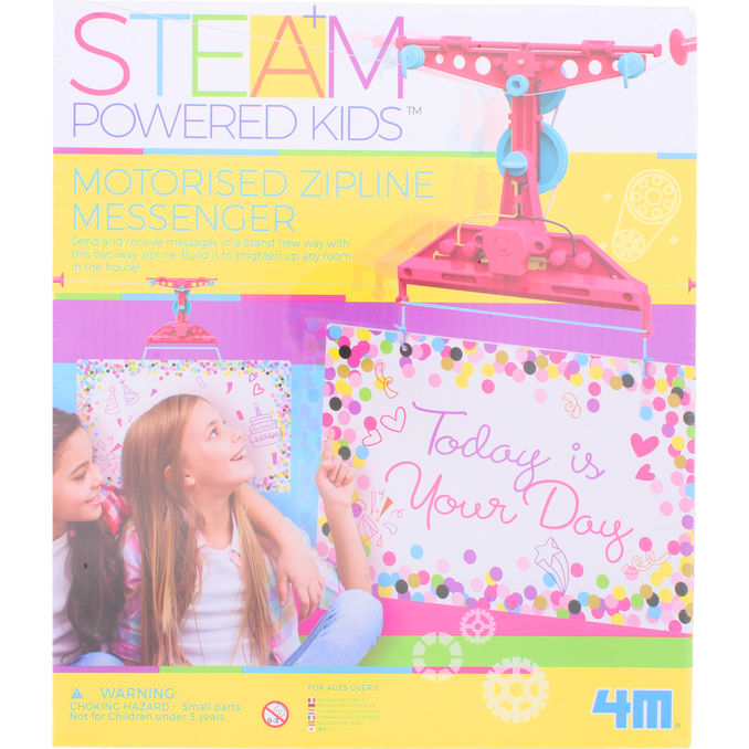 Steam Powered Kids Motorised Zipline Messenger er et lærerigt videnskabssæt, der lader børn bygge deres egen motoriserede svævebane til at sende beskeder tværs gennem værelset. Sættet kombinerer leg og læring ved at introducere grundlæggende mekanik og fysik på en sjov og interaktiv måde.
