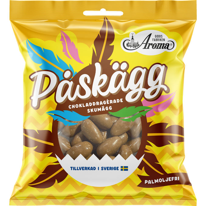 Aroma Påskeæger klassiske svenske påskeæg bestående af blødt skum dækket med et lækkert lag mælkechokolade. Disse velsmagende godbidder er fremstillet i Sverige uden brug af palmeolie, hvilket gør dem til et perfekt indslag i påskekurven eller som hygge for hele familien i helligdagene.