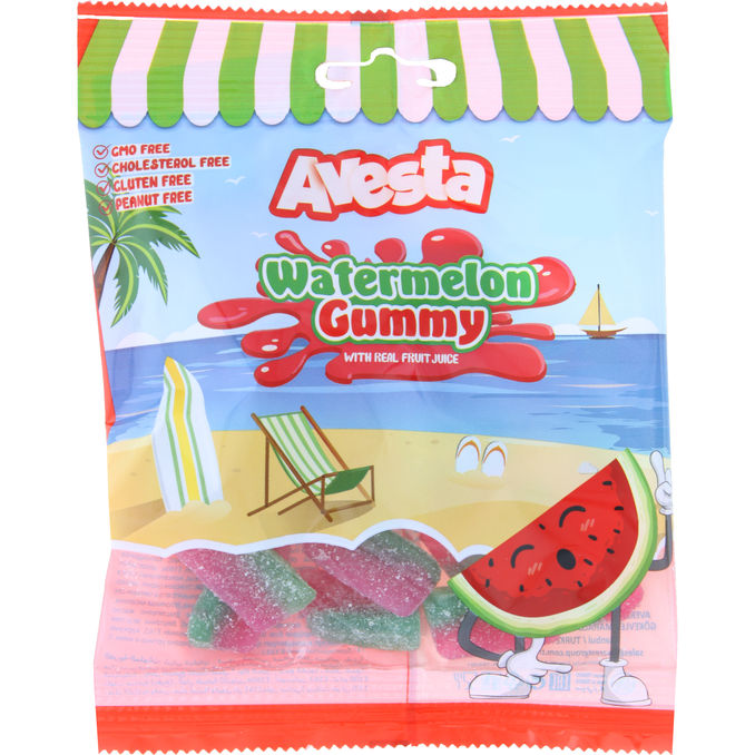 Avesta Glutenfri Vandmelonsvingummier 80 g er bløde og seje vingummier med en sød og forfriskende smag af vandmelon, der er lavet uden gluten. De er perfekte til at nyde som en lækker og velsmagende snack til enhver lejlighed.