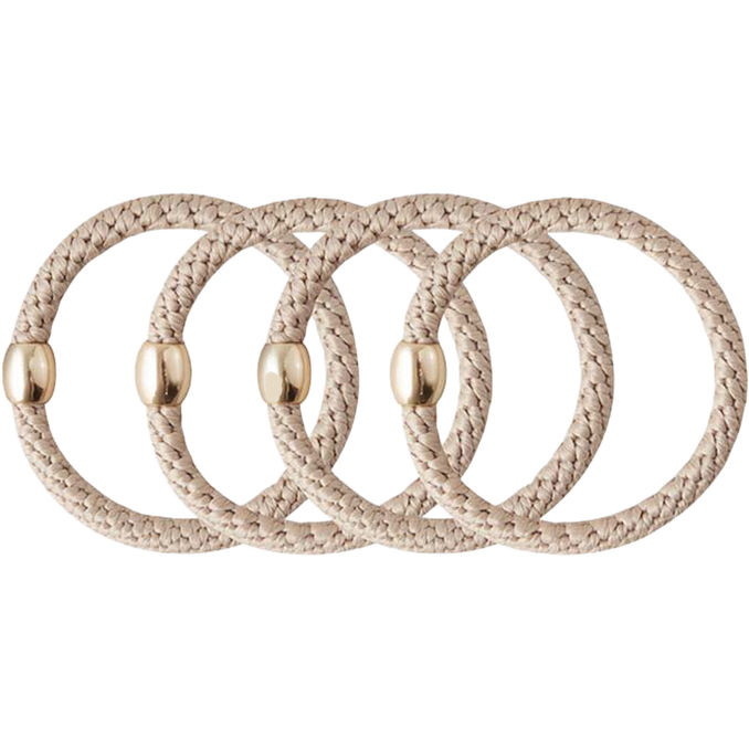 Disse Bangerhead hårelastikker i en flot beige nuance kombinerer funktionalitet med et elegant design, prydet med en fin gulddetalje. Den kraftige, flettede struktur sikrer et fast hold i alle hårtyper, samtidig med at de er skånsomme og minimerer risikoen for, at håret knækker eller filtrer.
