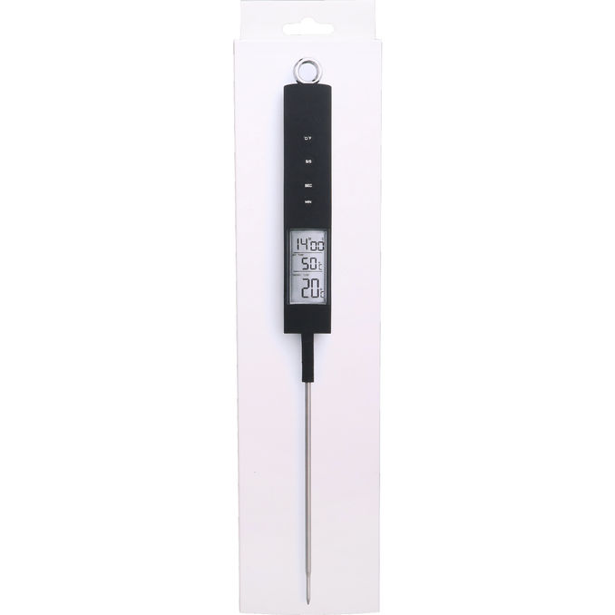Praktisk digitalt stegetermometer med tydeligt display og indbygget timer, der hjælper dig med at tilberede kød til perfekt temperatur. Udstyret med kabelprobe til brug i ovn og hurtig temperaturmåling for nem og præcis madlavning.