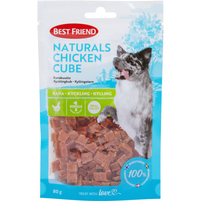 Best Friend Naturals Chicken Cube er lækre og naturlige hundesnacks lavet af førsteklasses kyllingekød, der er skåret i små, praktiske tern. Disse godbidder er rige på protein og har et lavt fedtindhold, hvilket gør dem ideelle som en sund belønning under træning eller som en hurtig snack mellem måltiderne.