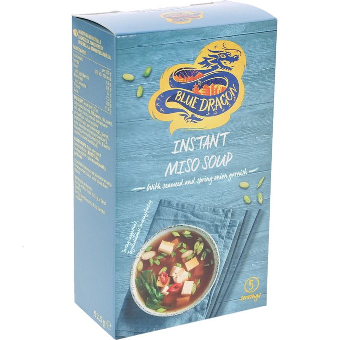 Instant Miso Soup fra Blue Dragon er en nem og hurtig løsning på en skøn, japansk-inspireret forret. Misosuppe har en dejligt saltet umamismag med noter af tang og fisk. Den egner sig godt som forret til japanske retter med nudler eller ris. Tilsæt kogende vand til suppepulveret samt de frysetørrede grøntsager, så har du en nem forret til et dejligt måltid.