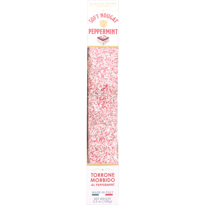 Borgo de Medici Nougat med Peppermint er en pakke på 100 g med klassisk italiensk nougat, der er tilsat en forfriskende smag af pebermynte. Den bløde og seje tekstur er kombineret med det kølige pust fra minten, hvilket giver en moderne og festlig balance til den ellers søde og traditionelle konfekt.