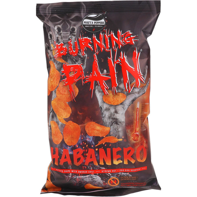 Burning Pain Habanero Chips er ekstra stærke kartoffelchips med den karakteristiske og intense varme fra habanero-chilien. Den lille pose på 80 g er skabt til dem, der tør kaste sig ud i en seriøst krydret snackoplevelse med masser af power.