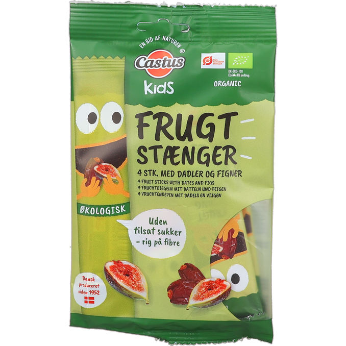 Castus Øko Frugtstænger Figen er bløde og naturlige frugtstænger baseret på økologiske dadler og figner helt uden tilsat sukker. De er rige på kostfibre og fungerer som en ideel snack til madpakken eller som et sundt mellemmåltid til både børn og voksne.