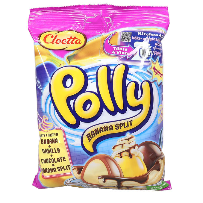 Cloetta Polly Banana Split er en uimodståelig blanding af de klassiske skumdragéer med smag af banan, jordbær og chokolade, inspireret af den populære dessert. Den store pose på 350 g er perfekt til deling og bringer en legende, sød sommerstemning til enhver slikskål.