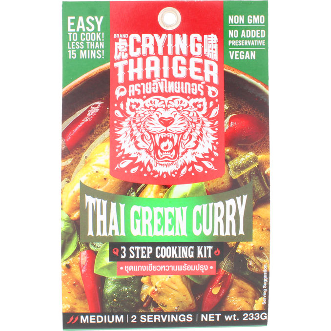 Dette Crying Thaiger 3 Step Cooking Kit indeholder de nødvendige ingredienser til let at tilberede en autentisk thailandsk grøn karryret. Kittet sikrer den karakteristiske krydrede og friske smag fra grøn karrypasta, kokosmælk og krydderier, og det er velegnet til et hurtigt måltid, hvor du kun skal tilføje kød og grøntsager.