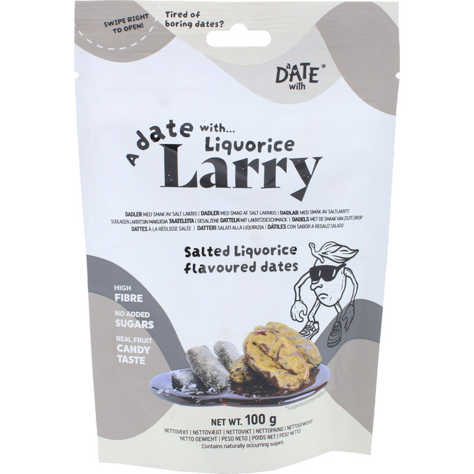 A Date with Dadler m. Saltlakrids 100 g er saftige dadler, der er overtrukket med en unik kombination af sødt og intenst saltlakrids. De er perfekte som en uimodståelig snack, der kombinerer den naturlige sødme med et delikat og salt pift.
