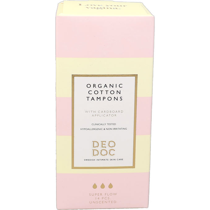 DeoDoc Organic Cotton Tampons With Applicator er økologiske tamponer fremstillet af 100% certificeret økologisk bomuld, der er fri for syntetiske materialer, parfume og blegemidler. Pakken med 14 stk. inkluderer en praktisk og glat applikator, som sikrer en nem og hygiejnisk indføring, mens det naturlige materiale lader huden ånde og mindsker risikoen for irritation i det intime område.