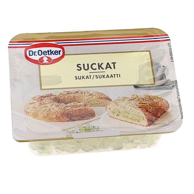 Dr. Oetker Sukat til bagning/ fyld til kagen. 100g. Sukat består af en kandiseret frugt som hedder cedrat, som er en citrus frugt.
