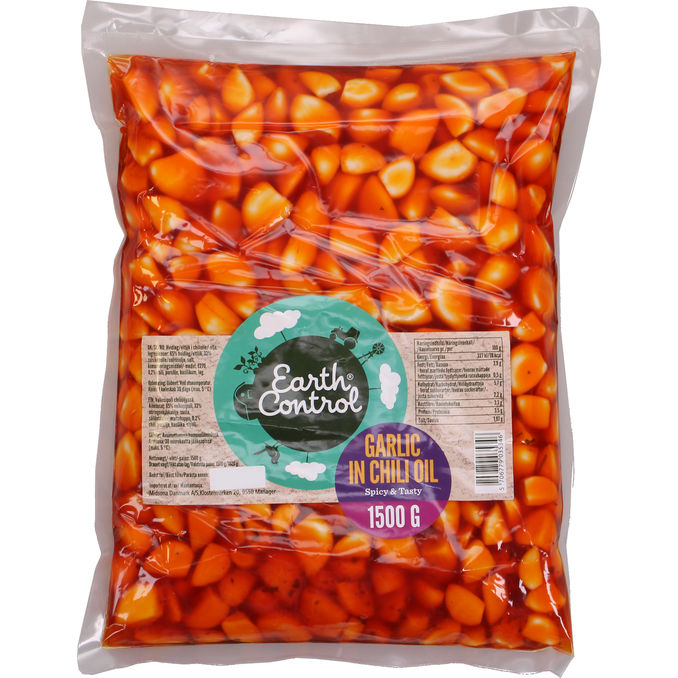 Earth Control Hvidløg i Chili Olie 1,5 kg er hele, sprøde hvidløgsfed lagt i en smagfuld olie med et krydret spark fra chili. Den store mængde gør produktet ideelt til storkøkkener eller til entusiasten, der bruger dem som tapas, i salater eller som smagsgiver i varme retter.