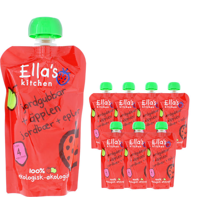 Ella's Kitchen Jordbær & Æble Puré 7-pak er en praktisk pakke med syv økologiske puréer, der kombinerer den søde smag af jordbær og æbler. De er perfekte som en sund og velsmagende snack til børn, der er nem at have med på farten.