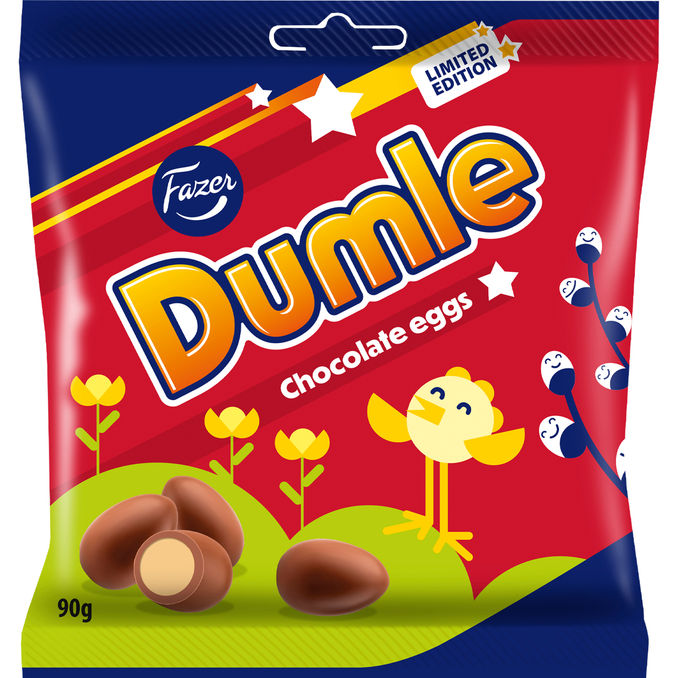 Fazer Dumle Chocolate Eggs er en uimodståelig påskenyhed, der kombinerer den klassiske Dumle-smag med en sprød chokoladeskal. Denne Limited Edition-pose på 90 g indeholder små chokoladeæg fyldt med den bløde og velkendte karamel, hvilket gør dem til en perfekt lille godbid eller en lækker tilføjelse til påskens slikskål.