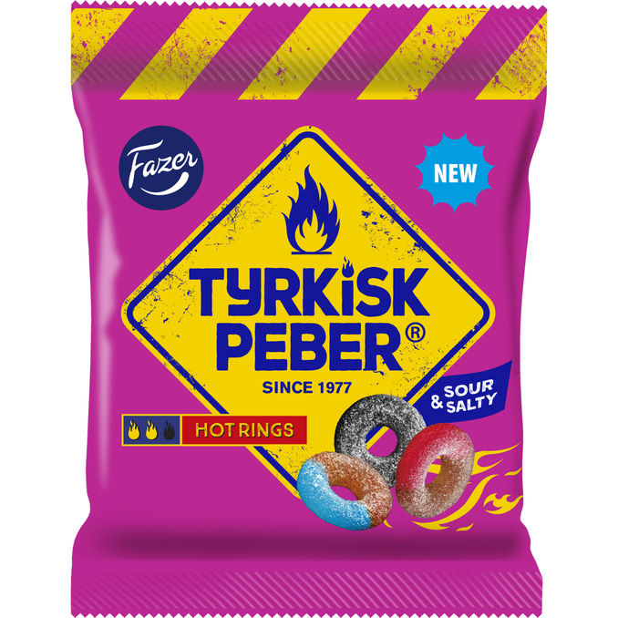 Fazer Turkish Pepper Hot Rings Sour & Salty er slikringe med en intens kombination af syrlig frugtsmag og salt salmiaklakrids. En spændende smagsoplevelse med en markant styrke, der passer til dem, der elsker stærke, salte og syrlige slik med ekstra karakter.