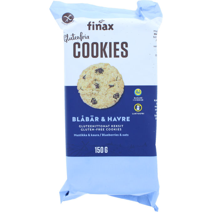 Glutenfri Finax Blåbær- og Havrecookies er sprøde småkager med en lækker kombination af sunde havregryn og søde blåbær. Pakken på 150 g er et ideelt valg til en hurtig snack eller kaffepausen for alle, der ønsker et velsmagende og glutenfrit alternativ.