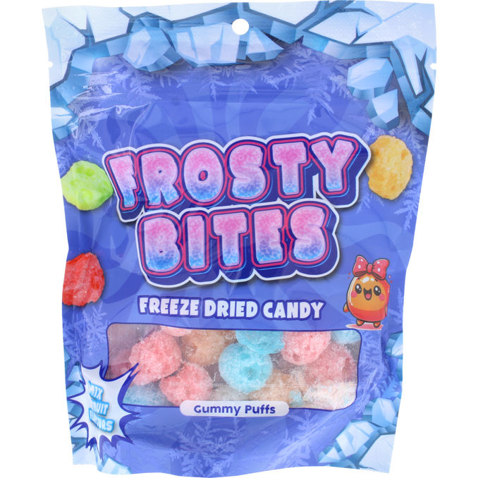 Frosty Bites Frysetørret Slik 50 g er en snack, der er kendt for sin intense smag og unikke, sprøde og luftige tekstur. Slikket gennemgår en frysetørringsproces, der bevarer den rene og stærke smag, mens det får et tilfredsstillende knas. Det er en sjov og overraskende godbid, der giver en helt ny måde at nyde dit yndlingsslik på.