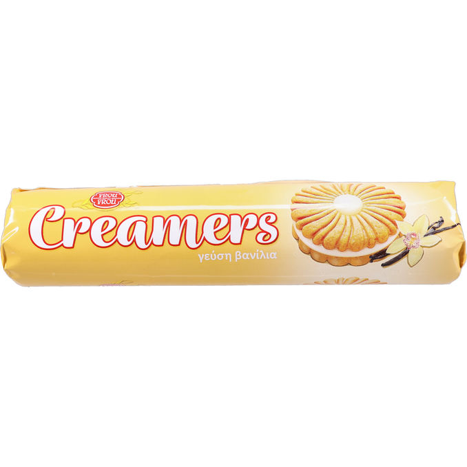 Frou Frou Creamers Vaniljekiks er sprøde kiks med et lækkert, cremet fyld med en mild og rund smag af vanilje. Pakken på 175 g er perfekt til at dele eller til at nyde sammen med en kop te eller kaffe som en sød hverdagsforkælelse.