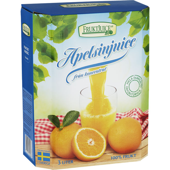 Fruktjuice AB Apelsinjuice er en forfriskende juice lavet af 100% frugt fra koncentrat. Den leveres i en praktisk 3-liters box med hane, hvilket gør den ideel som hele familiens favoritdrik til morgenbordet.