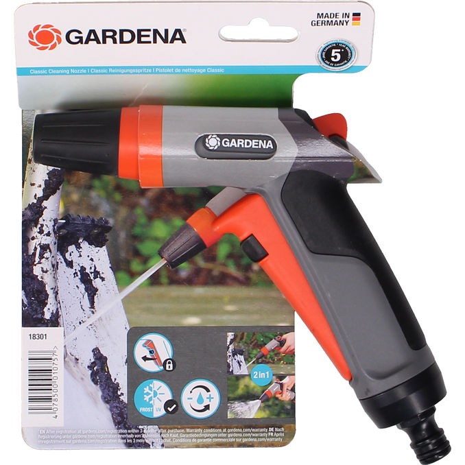 Gardena Classic Rengøringsdyse er et alsidigt redskab til haven, der tilbyder både en hård stråle til effektiv rengøring og en fin tåge til skånsom vanding af planter. Sprøjtepistolen er designet med ergonomisk greb, trinløs regulering af vandmængden og en praktisk låsefunktion, så man kan vande kontinuerligt uden at blive træt i hånden.