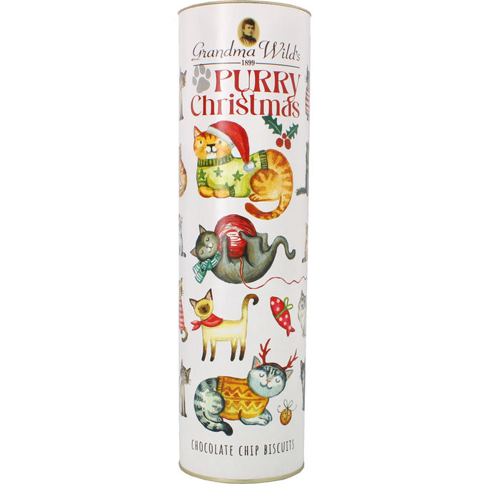 Granda Wilds Chocolate Chip Cookies "Purry Christmas" er sprøde småkager med chokoladestykker, præsenteret i en charmerende dåse med et julet kattemotiv. Den dekorative indpakning gør dem til en oplagt gaveidé eller en hyggelig værtindegave til julemånedens sammenkomster.