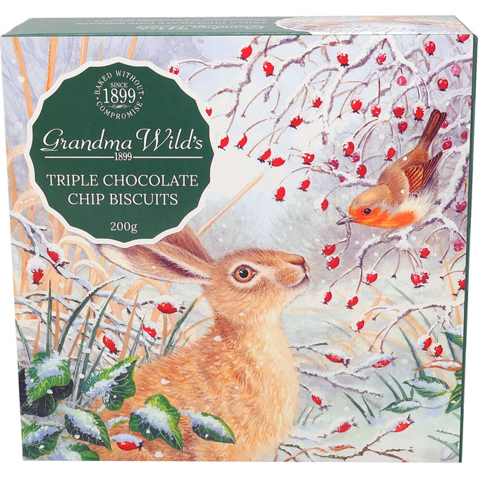 Grandma Wilds Triple Chocolate Chip Biscuits 200 g er den ultimative fristelse for chokoladeelskere, da de kombinerer en sprød småkagebund med hele tre typer chokolade: mørk, lys og hvid. Disse luksuriøse kiks er bagt med stolthed efter traditionelle metoder i Yorkshire, hvilket sikrer en rig smag og en perfekt tekstur, der smelter på tungen.