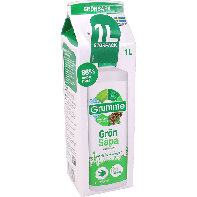 Grumme Grøn Sæbe er et klassisk og alsidigt rengøringsmiddel baseret på ægte fyrreolie, der effektivt fjerner snavs og efterlader en frisk duft i hjemmet. Denne miljøvenlige klassiker er både vegansk og Svanemærket, og den leveres her i en praktisk karton med 86 % mindre plast. Det er det ideelle valg til en grundig og bæredygtig rengøring af alt fra gulve til bordplader.