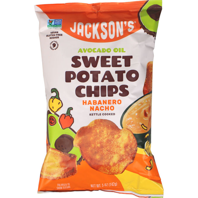 Jackson Sweet Potato Chips Habanero Nacho (142 g) er sprøde søde kartoffelchips med en intens habanero- og nachosmag. Perfekte til dem, der elsker krydrede og smagfulde snacks.