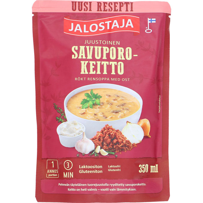 Jalostajas røget rensdyrsuppe med ost er hverdagens laktosefrie og en mættende redning til den store sult. Den er pakket i en lufttæt pakke, der er nem at tage med. Rensdyrsuppen får sin smag fra mild fløde og blødt rensdyrkød fra det finske landskab, hvilket gør denne delikatesse til et perfekt måltid for hele familien.