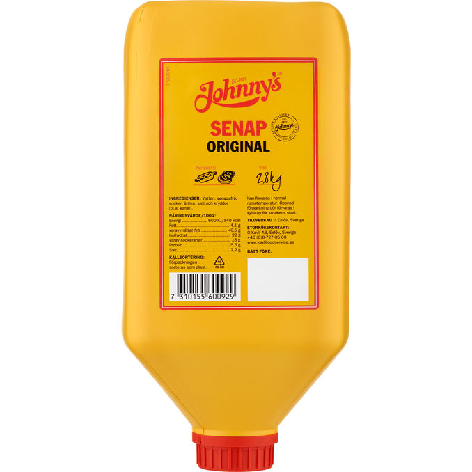 Johnny's Senap Original er en karakterfuld sennep med en unik balance mellem sødme og styrke samt et let strejf af krydderier. Den store beholder på 2,8 kg er ideel til større sammenkomster eller professionelt brug og passer perfekt til pølser, burgere og klassiske kødretter.