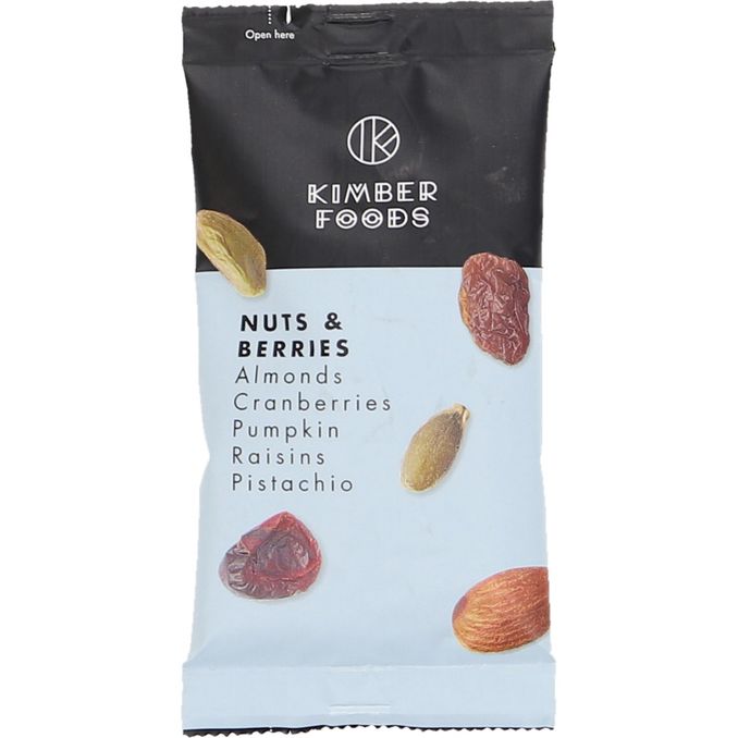 Nuts & berry er et skønt miks af mandler, tranebær, græskarkerner, rosiner og pistacienødder. Kommer i en pose på 20g.
