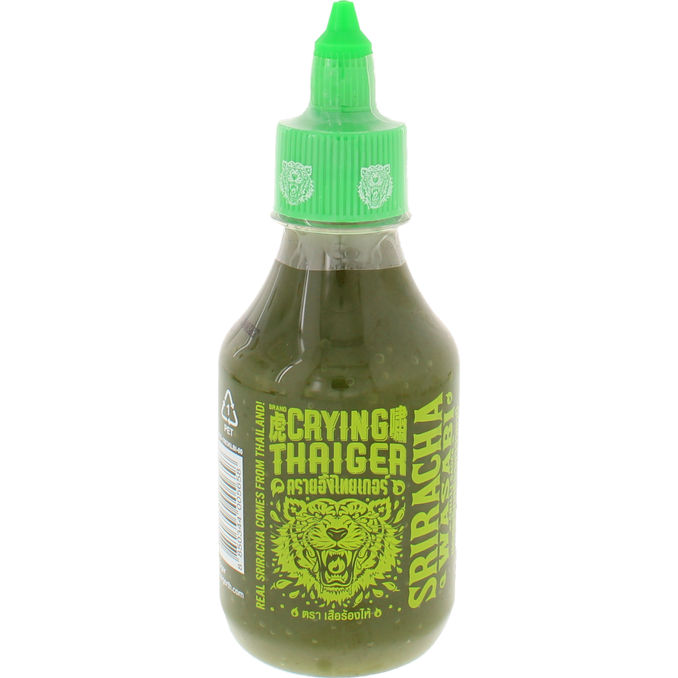 Crying Tiger Sriracha Wasabi Chilisauce 200 g er en kraftfuld og unik sauce, der kombinerer den velkendte chili-varme fra sriracha med det skarpe, rensende bid fra wasabi. Denne intense smagskombination gør den særdeles velegnet som dyppelse til sushi, fisk og skaldyr eller som en spændende ingrediens i asiatisk-inspirerede dressinger og marinader.