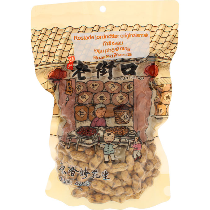 LaojieKou Ristede Jordnødder Original 420 g er sprøde og smagfulde jordnødder af høj kvalitet, der er ristet med deres naturlige skal på for at bevare den autentiske, nøddeagtige aroma. Denne store pakning er perfekt som en sundere snack eller som en hyggelig aktivitet, hvor man selv knækker skallerne for at komme ind til de perfekt ristede kerner.