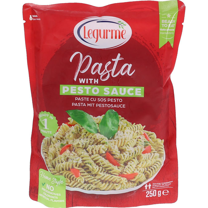 Færdiglavet pasta med cremet pestosauce lavet på basilikum, hvidløg og ost – et smagfuldt måltid. Nem at varme op og perfekt som en hurtig frokost eller aftensmad, når du har lyst til noget lækkert på bare et minut.
