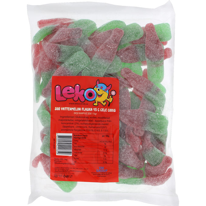 Leko Sure Vingummier Vandmelon 1 kg er en stor pose med bløde og seje vingummier, der byder på en sød og syrlig smag af vandmelon. De er perfekte til at dele ud til mange, til at have på lager til fester eller til at nyde som en velsmagende pause.