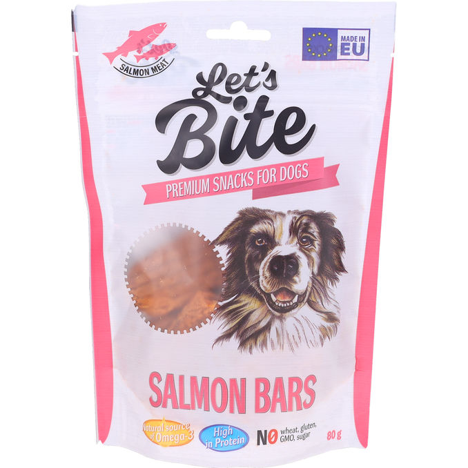 Let's Bite Salmon Bars Hundesnacks er en pose med 80 g lækre snackstænger til hunde, der er baseret på laks af høj kvalitet. Disse godbidder er rige på naturlige omega-3 fedtsyrer, som bidrager til en sund hud og en blank pels, samtidig med at den bløde tekstur gør dem nemme at tygge eller brække i mindre stykker.