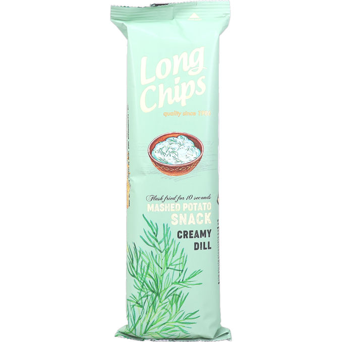 Long Chips Creamy Dill er unikke, lange og sprøde chips lavet af kartoffelmos med en lækker smag af cremet dild. Den flade form og den milde krydring giver en anderledes snackoplevelse, der er perfekt til dem, som elsker kombinationen af urter og sprødhed.