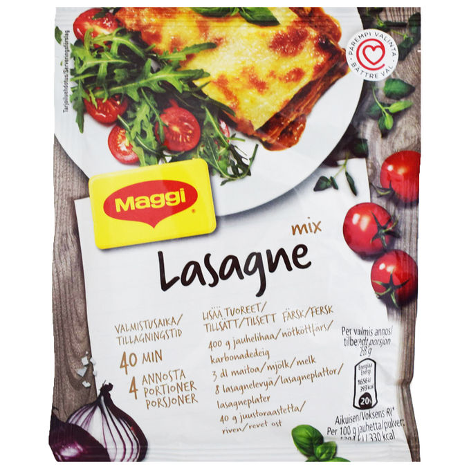 Med MAGGI Mix lasagneingredienser kan du nemt tilberede en traditionel oksekødslasagne eller alternativt en grøntsagslasagne. Ingredienserne ligner dem, der findes i skabet i køkkenet, og produktet er blevet tildelt hjertemærket, hvilket indikerer, at produktet er en bedre mulighed ud fra et sundhedsmæssigt synspunkt. Tomater modnet i solen, samt grøntsager og urter, giver en rig smag.