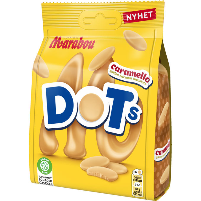 Marabou Dots Caramello (120 g) er chokoladeknapper med en blød karamelsmag. Ideelle som en sød snack eller til deling.