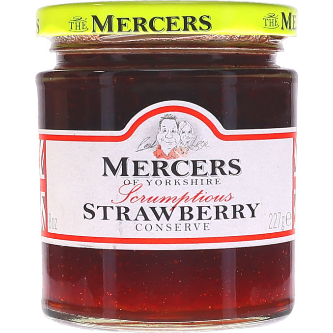 Mercers Strawberry Conserve er en frugtagtig, sød jordbærmarmelade lavet med en høj andel af ægte jordbær, hvilket giver den en rig bærsmag. Den er perfekt til at smøre på toast, muffins eller pandekager, men fungerer lige så godt som fyld i kager eller som topping på is og yoghurt.