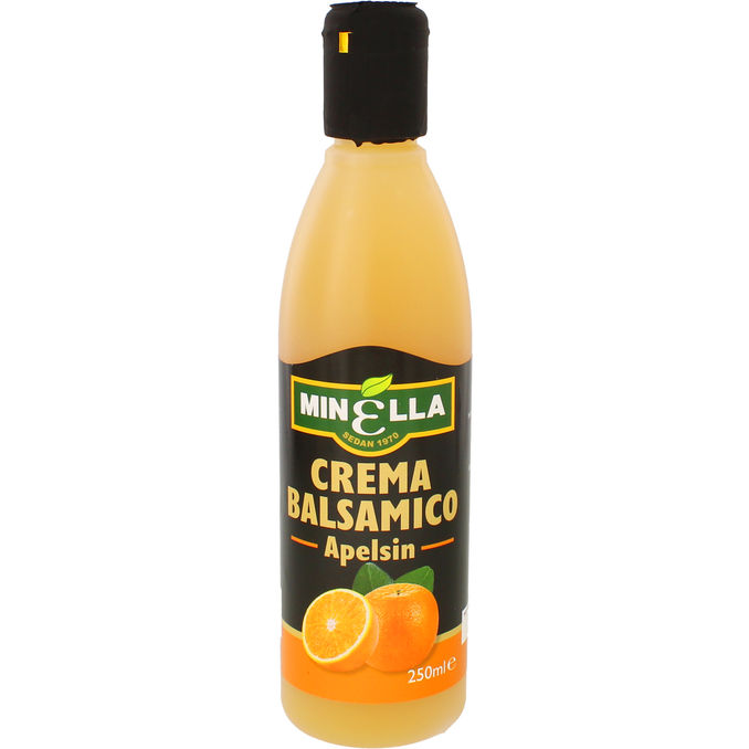 Minella Crema Balsamico med appelsin er en tyktflydende balsamico-glace, der kombinerer den klassiske syre fra balsamico med en frisk og sødmefuld note af appelsin. Den er særdeles velegnet som dekorativ topping på desserter, modne oste eller som et frugtigt pift til en frisk sommersalat.