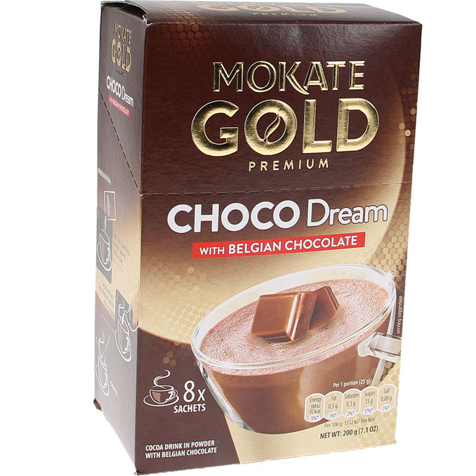 Instant varm kakao Mokate Gold Premium Choco Dream med belgisk chokolade er en lækker varmdrik med en behagelig eftersmag af chokolade, med et strejf af vaniljesmag og et fløjlsblødt skum. Instant chokoladedrik Mokate Belgisk chokolade har en cremet tekstur, behagelig smag og let aroma af chokolade. Fremgangsmåde: Hæld posens indhold i en kop (120-150 ml). Hæld varmt vand (80°C) og bland.