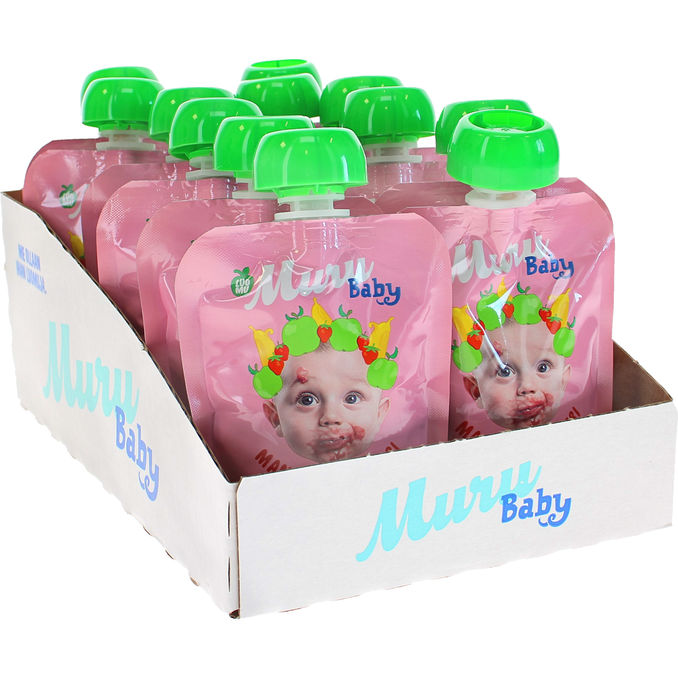 Et økologisk mellemmåltid for din baby med æble, banan, jordbær og youghurt. Fra 6 mdr. Glutenfri og Sukkerfri.
