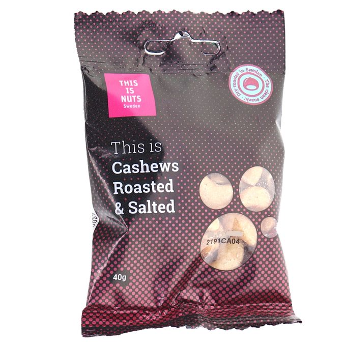 This Is Nuts Cashew Ristet & Saltet er en lille pose tørristede og saltede cashewnødder. Cashewnødderne er tørristede ved hjælp af en patenteret metode, der stammer fra Mellemøsten, hvilket giver dem en unik smag.