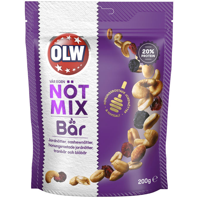 OLW Nøddemix m. Bær (200 g) er en blanding af sprøde nødder og søde, tørrede bær. Perfekt som en lækker snack eller topping til yoghurt og salater.