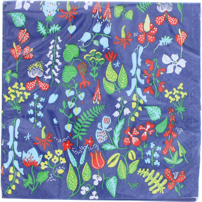 Smukke papirservietter i 33x33 cm, perfekte til at give borddækningen mere farve og nuancer, hvilket gør den ekstra smuk. Mønstret er det klassiske "Herbarium" med mørk baggrund, designet af den kendte svenske designer Stig Lindberg. Kommer i en pakke med 20.