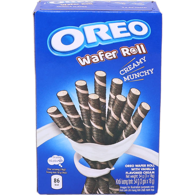 Oreo Wafer Roll Vanilla er en sprød og let udgave af den klassiske Oreo, formet som tynde ruller med et lækkert fyld af vaniljecreme. Posen på 54 g indeholder sprøde chokoladewafer-rør, der giver et herligt knas og den velkendte Oreo-smag i et nyt format, som er nemt at nyde på farten eller som en lille ekstra detalje til desserten.