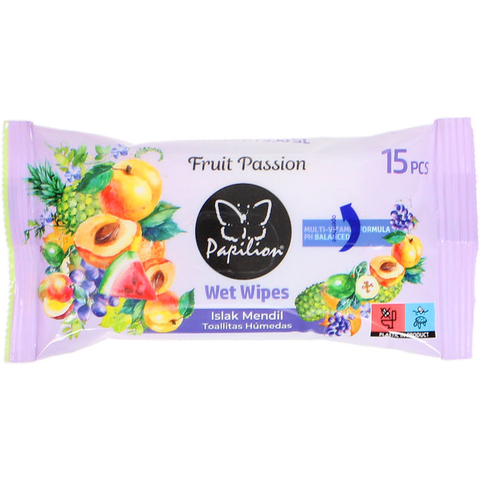 En pakke med 15 vådservietter med en frugtagtig duft, perfekt til rejsen.
