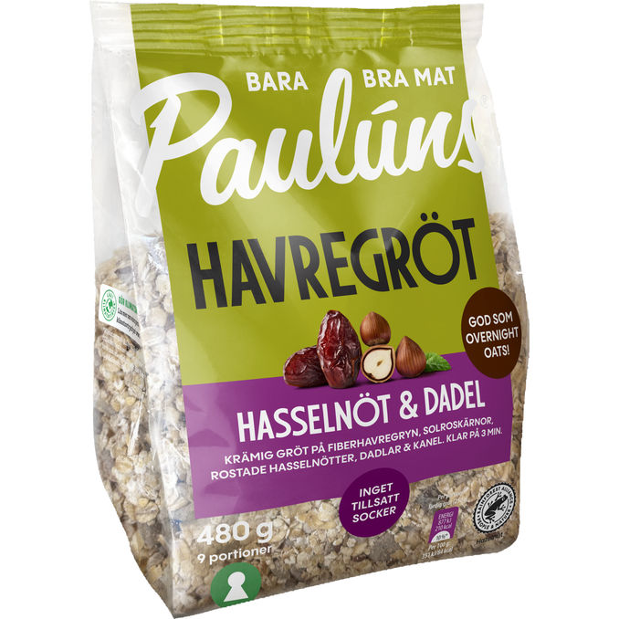 Paulúns Havregrødsblanding med hasselnød og dadel er en nærende kombination af fiberhavregryn, sprøde nødder og naturligt søde dadelstykker. Blandingen er rig på fibre og uden tilsat sukker, hvilket gør den ideel til en hurtig og mættende morgenmad.