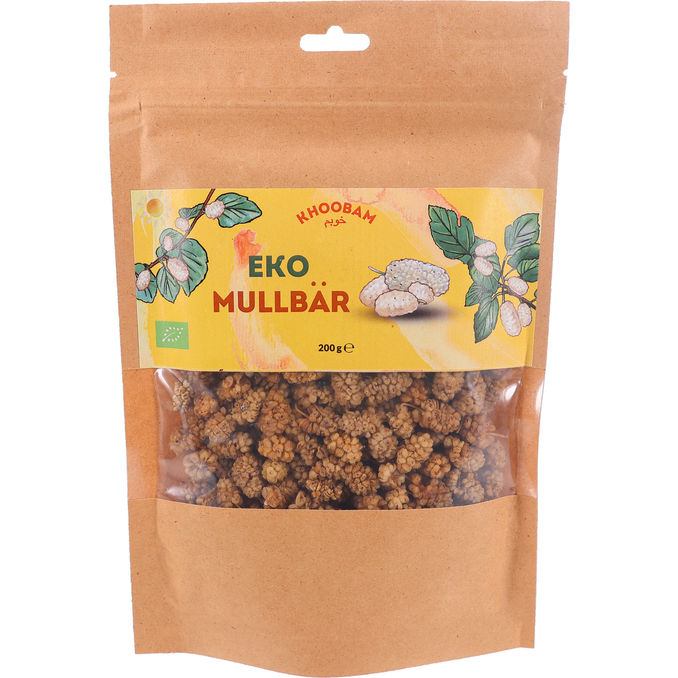 Tørrede Morbær 200 g er søde og seje morbær, der er rige på fibre og naturlig sødme, perfekte som en sund snack. De er ideelle til at drysse over morgenmadsprodukter, i bagværk eller til at nyde alene som et energigivende mellemmåltid. Bemærk: De sorte pletter på emballagen er fejlprint, som er blevet overstreget for at undgå misforståelser om produktets indhold.